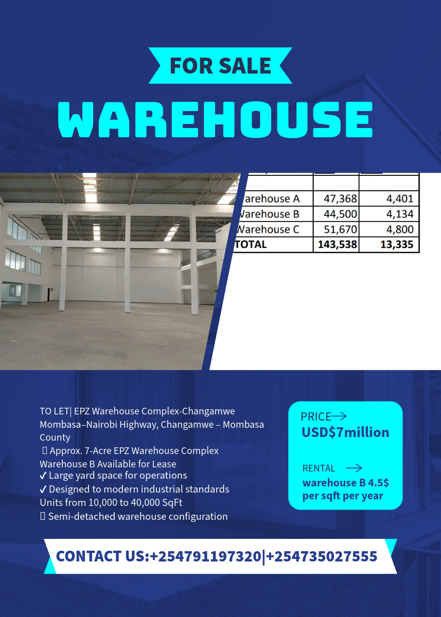 Strategically positioned fronting the MombasaβNairobi Highway, this modern warehouse complex offers flexible industrial space within a prime logistics corridor. Ideal for manufacturing, storage, distribution, and export-oriented businesses.