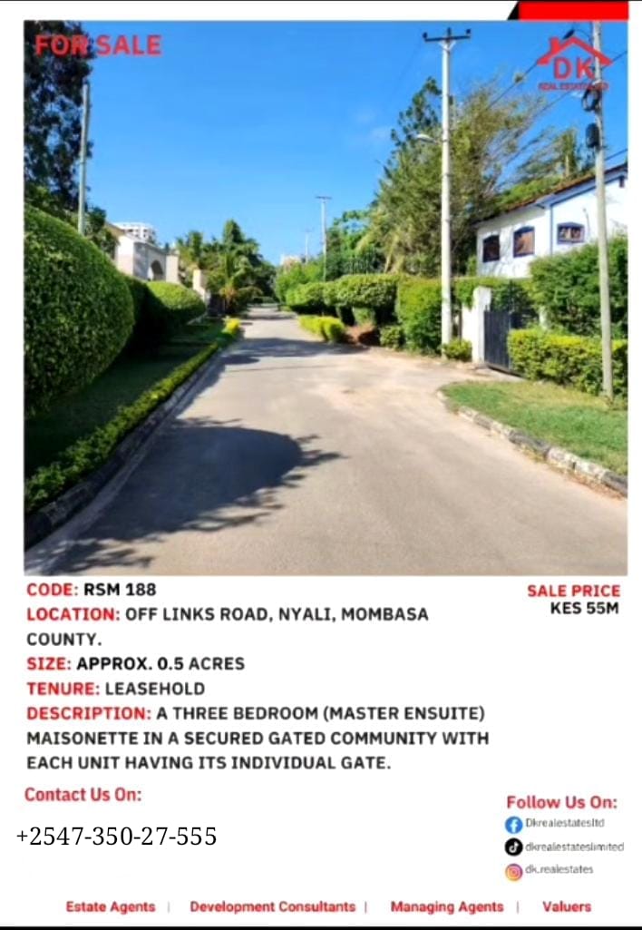 Discover refined living in the heart of Nyali, Mombasa β a charming 3-bedroom (master ensuite) maisonette nestled in a serene, highly secure gated community off Links Road.