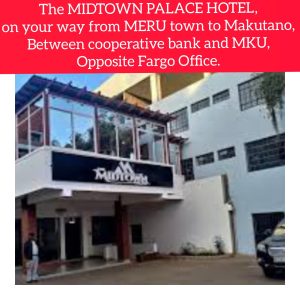 THE MIDTOWN PALACE HOTEL, UPSTAIRS – ON YOUR WAY FROM MERU TOWN TO MAKUTANO BETWEEN COOPERATIVE BANK AND MKU, OPPOSITE FARGO OFFICE.